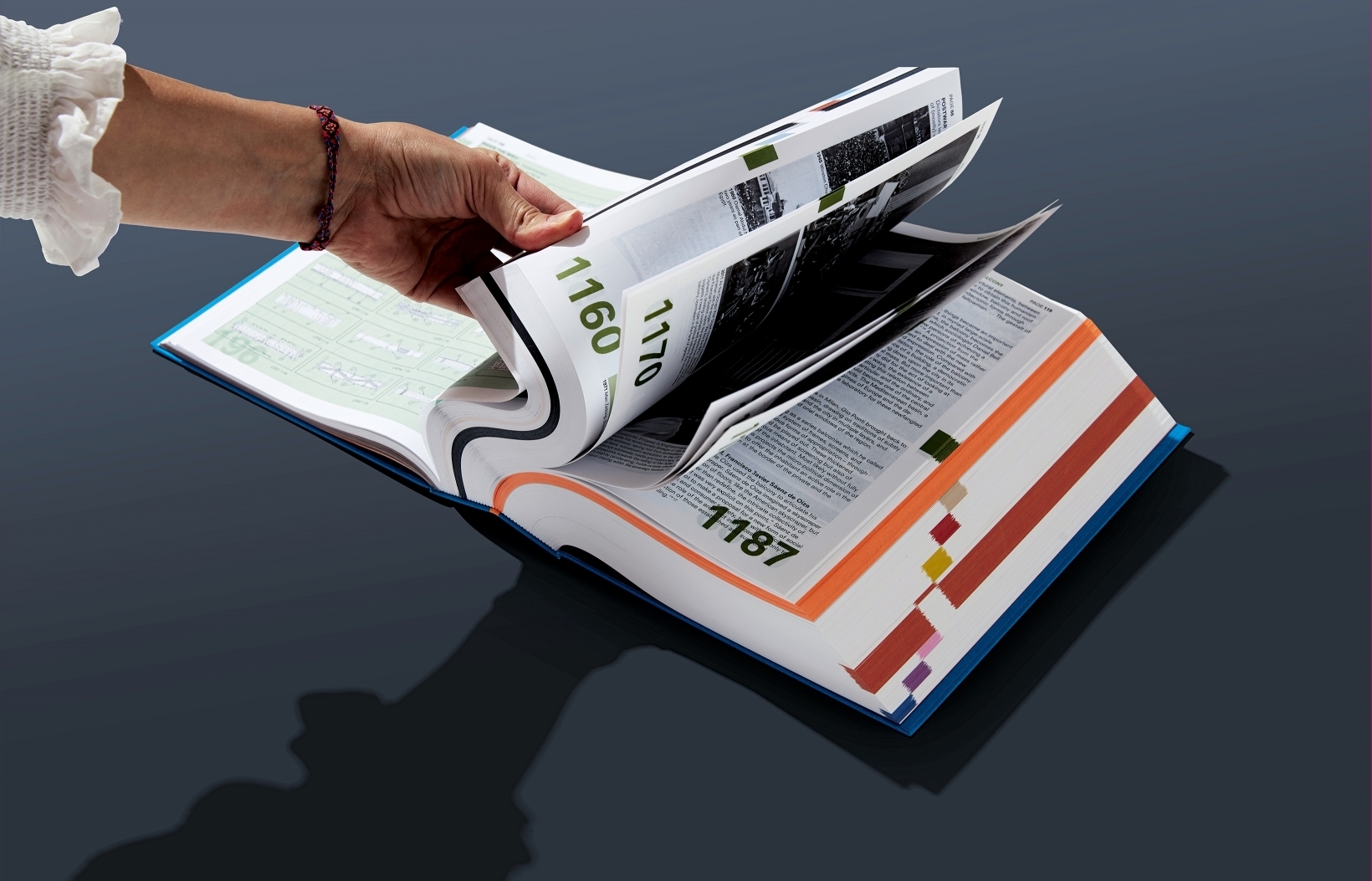 - maßgefertigter Einband mit zweigeteiltem Buchrücken: Unser Drucker hat seine Buchbindemaschine umgebaut, um den flexiblen, acht Zentimeter dicken Rücken zu ermöglichen