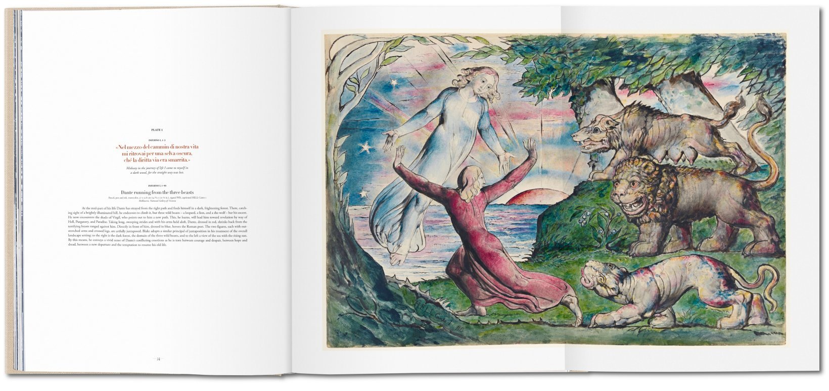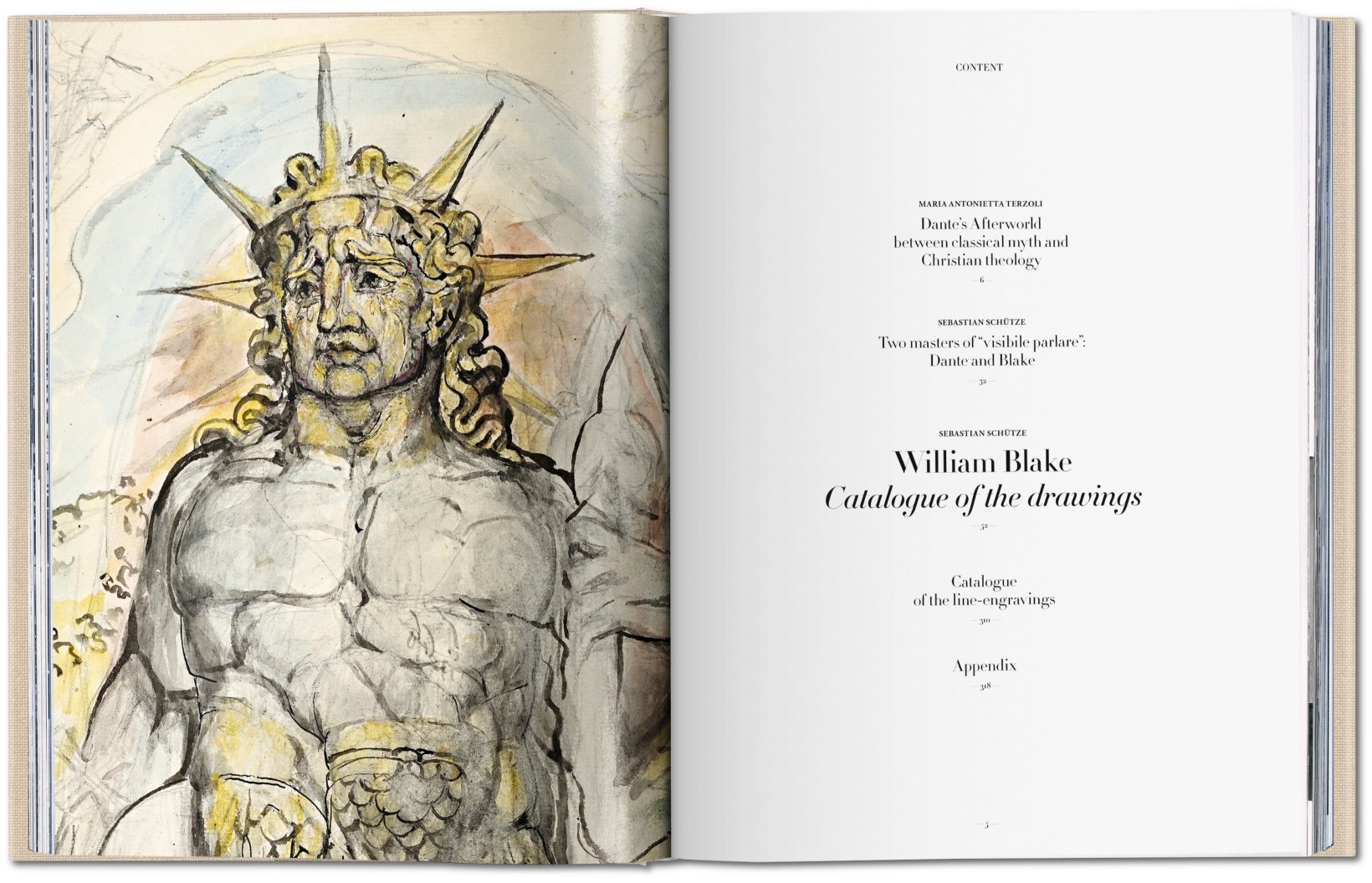Die Göttliche Komödie von Dante Alighieri (1265–1321) gilt als größtes literarisches Werk der italienischen Sprache (vollendet 1321) und Meisterwerk der Weltliteratur. Das Opus beschreibt die Reise des Dichters durch Hölle und Fegefeuer in den Himmel, und auf einer tieferen Ebene den symbolischen Weg der Seele zu Gott.In seinen letzten Lebensjahren vollendete der Poet und Maler William Blake (1757–1827) 102 Illustrationen zu Dantes epischer Dichtung, die von Bleistiftskizzen bis hin zu fertigen Aquarellen reichen. Blake gelingt es, die visionäre Kraft von Dantes Sprache in Bilder zu übersetzen und in ihrer ganzen Spannbreite darzustellen: von den Qualen der Hölle bis zur Glückseligkeit des Paradieses, von grausamen Verstümmelungen der Verdammten bis hin zur göttlichen Schönheit der Erlösten. Wenngleich Blake dem Text Dantes treu blieb, brachte er seine eigene Betrachtungsweise zu zentralen Themen des Werkes ein.