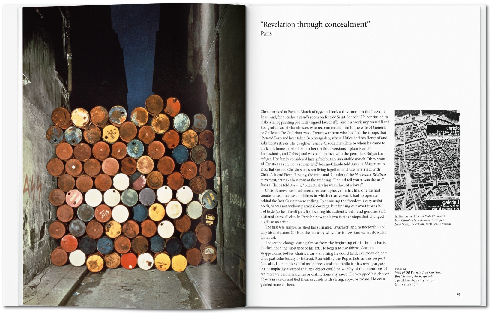 15Dieses kompakte Buch umfasst die komplette Karriere des Paares, das am gleichen Tag geboren wurde, sich Ende der 1950er in Paris kennen- und lieben lernte und zu einem beispiellosen Kreativteam zusammenwuchs. Üppig bebildert, reicht das Buch von Christos und Jeanne-Claudes frühesten Projekten Ende der 1950er bis zu The Floating Piers, die 2016 auf dem italienischen Iseo-See installiert werden. Das Buch enthält natürlich alle berühmten Projekte des Paares, wie etwa The Gates im New Yorker Central Park und den Wrapped Reichstag in Berlin, zeigt aber auch frühe Zeichnungen und Familienfotos, die der breiten Öffentlichkeit bisher weitgehend unbekannt waren.