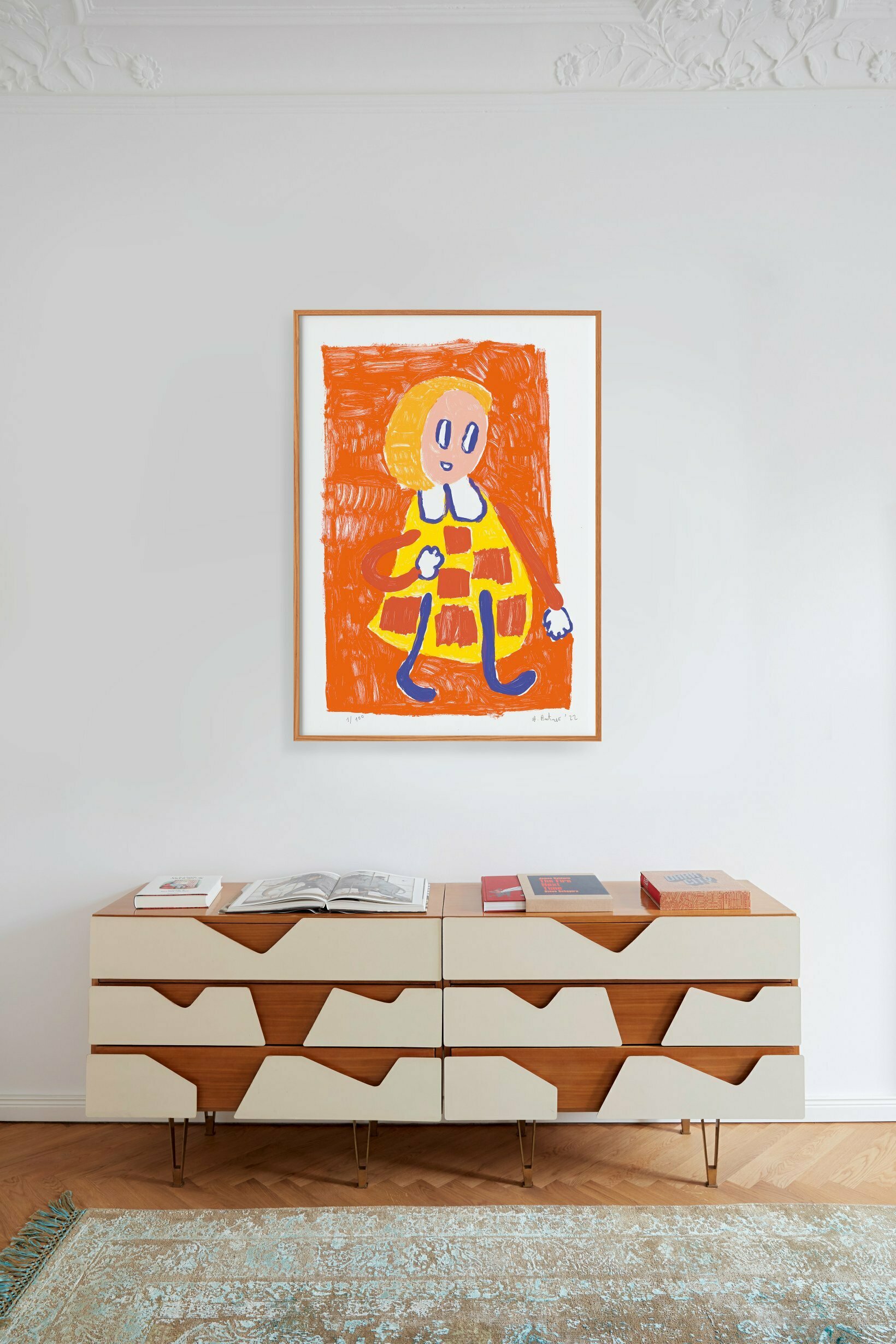 Dieser exklusive Siebdruck widmet sich André Butzers ikonischem Charakter der „Frau“, die als Leitstern seines Werkes eindrücklich Daseinszuversicht und gelebte Erfahrung verkörpert. Die aufwendig gedruckten Siebdrucke erscheinen unmittelbar und souverän in ihrer Einfachheit und Fülle – jeder Strich und jeder Farbfleck schimmert wie von Hand gemalt.