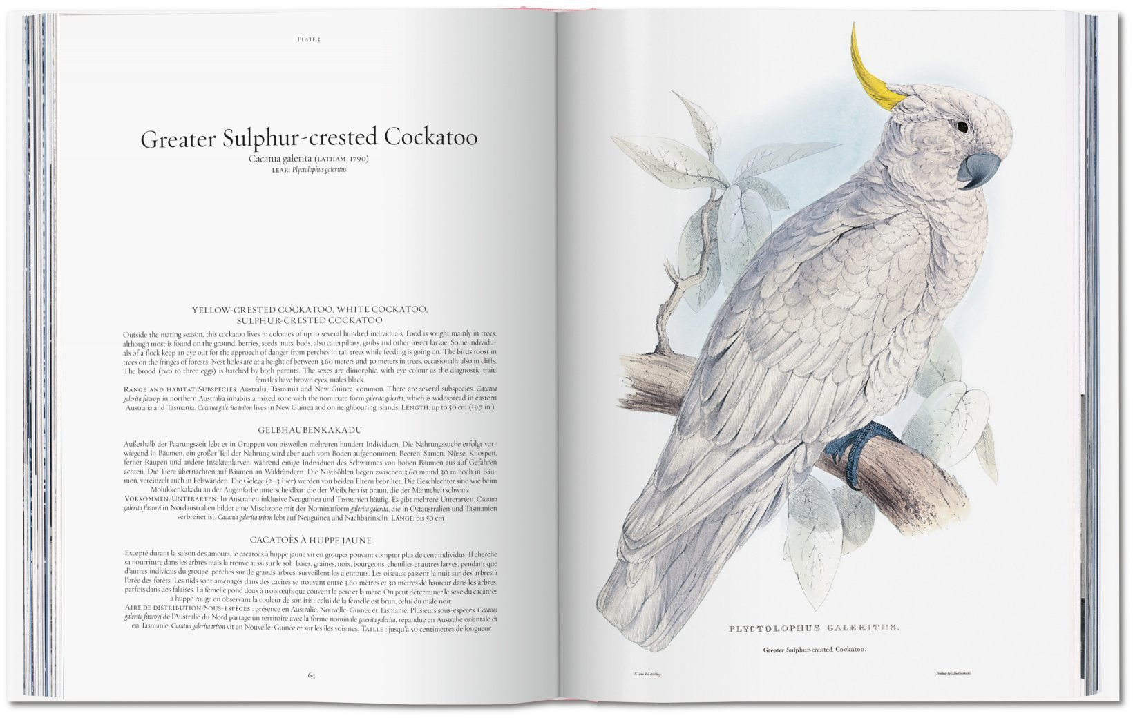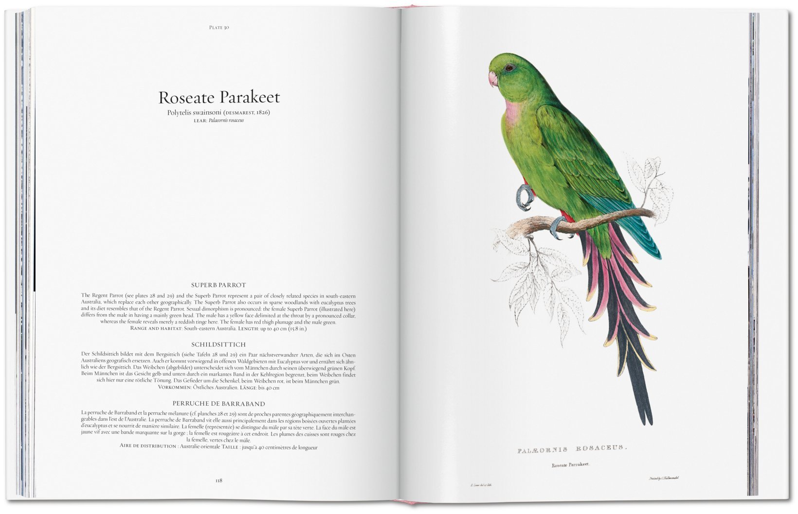 Edward Lear (1812–1888), den meisten wohl eher für seine Nonsense-Verse bekannt, machte in jungen Jahren durch Illustrationen von Vögeln und Reptilien auf sich aufmerksam. Dieses Set aus 42 handkolorierten Lithographien erschien ursprünglich unter dem Titel Illustrations of the Family of Psittacidae, or Parrots (Illustrationen zur Familie Psittacidae oder der Papageien) und verkörpert den Höhepunkt seiner vergleichsweise kurzen Karriere als naturkundlicher Zeichner, bevor er sich aufgrund nachlassender Sehkraft auf das Schreiben konzentrierte.