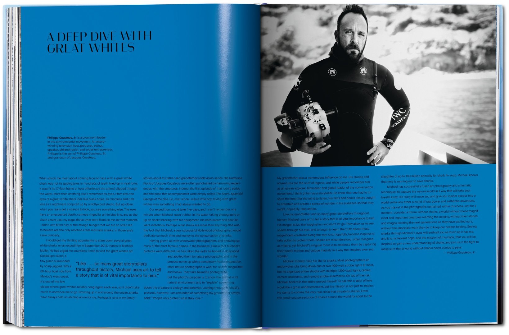 Um Mullers Engagement für Schutzorganisationen wie WildAid und EarthEcho zu würdigen, informieren Essays von Philippe Cousteau jr. und Dr. Alison Kock über Erforschung und Schutz unserer Ozeane. Der Kulturjournalist Arty Nelson gibt einen Überblick über Mullers Schaffen; zudem werden die technischen Details der Ausrüstung erläutert, die diese spektakulären Unterwasserbilder ermöglichte. In seiner Verbindung aus Hintergrundinformation und atemberaubenden Bildern ist dieses Buch ein Tribut an die Schönheit und Kraft der Haie – und ein Weckruf, was ihre gefährdete Zukunft betrifft.