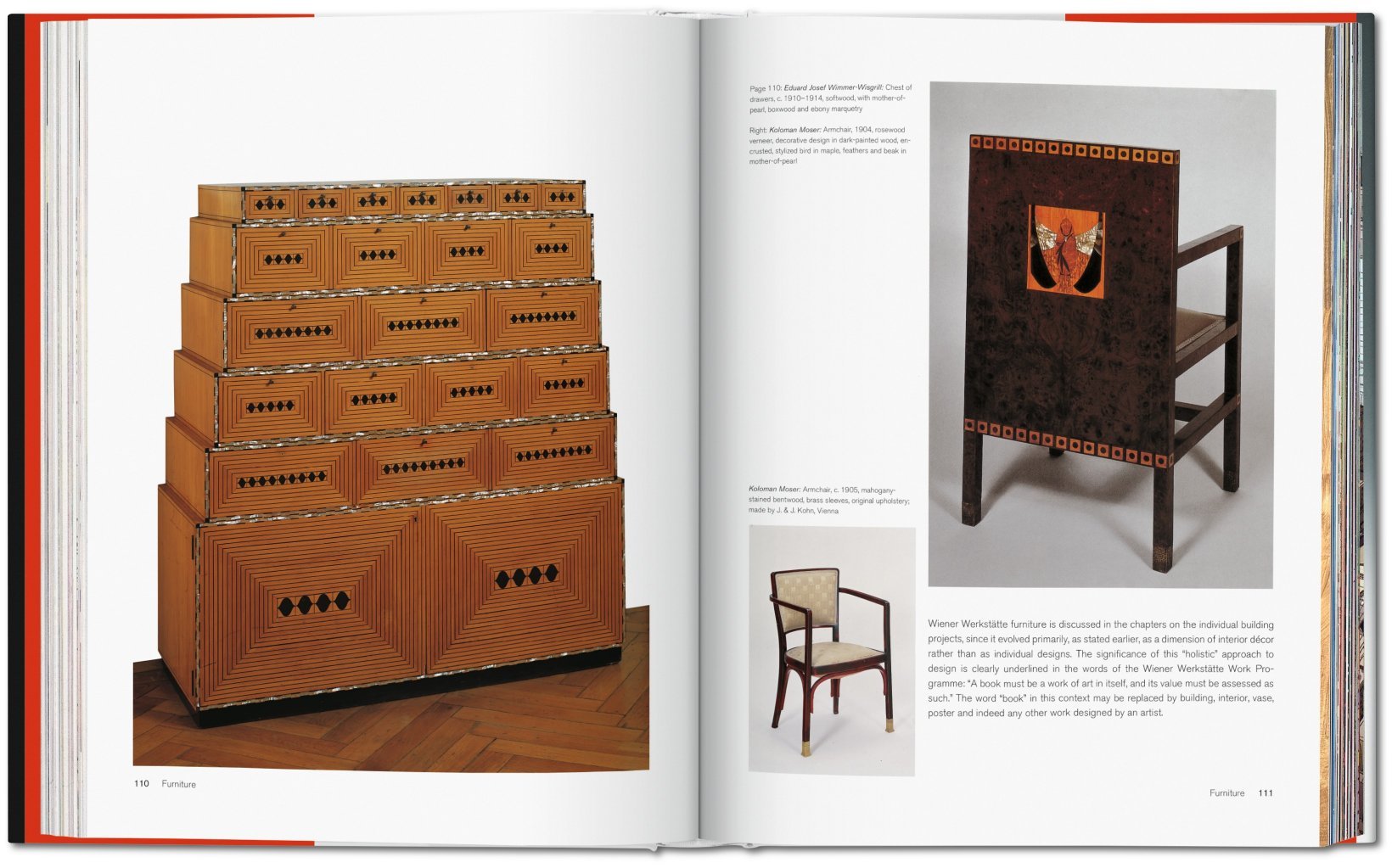 The workshop began life in three small rooms, but soon expanded to fill a three storey building with special departments for metalwork, leatherwork, and woodwork, as well as a book binder and a paint shop. Artists experimented with various materials such as gold, precious stones, and papier mâché and applied their simple, often geometric, designs across