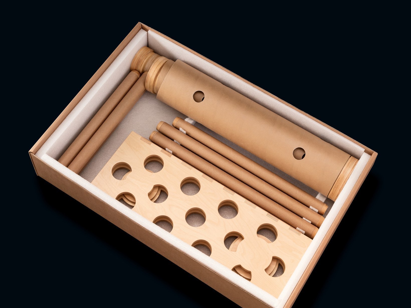 Consulte las instrucciones de montaje que se adjuntan con la mesa. Según las instrucciones del artista, las patas se montan de atrás adelante, empezando por las más anchas (parte posterior derecha) y terminando por las más pequeñas (parte anterior izquierda). Los tubos de cartón pueden insertarse por ambos lados, pero empezando siempre por la parte superior. Para terminar, despliegue la plataforma de madera y colóquela en la base. Antes de poner el libro plano en la plataforma, compruebe la estabilidad del atril.
