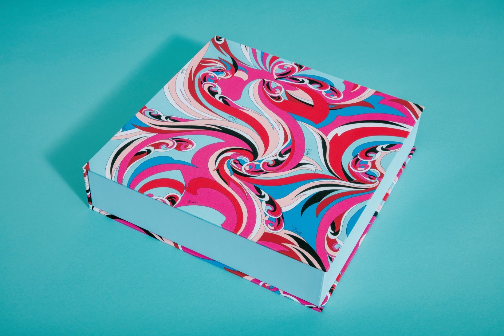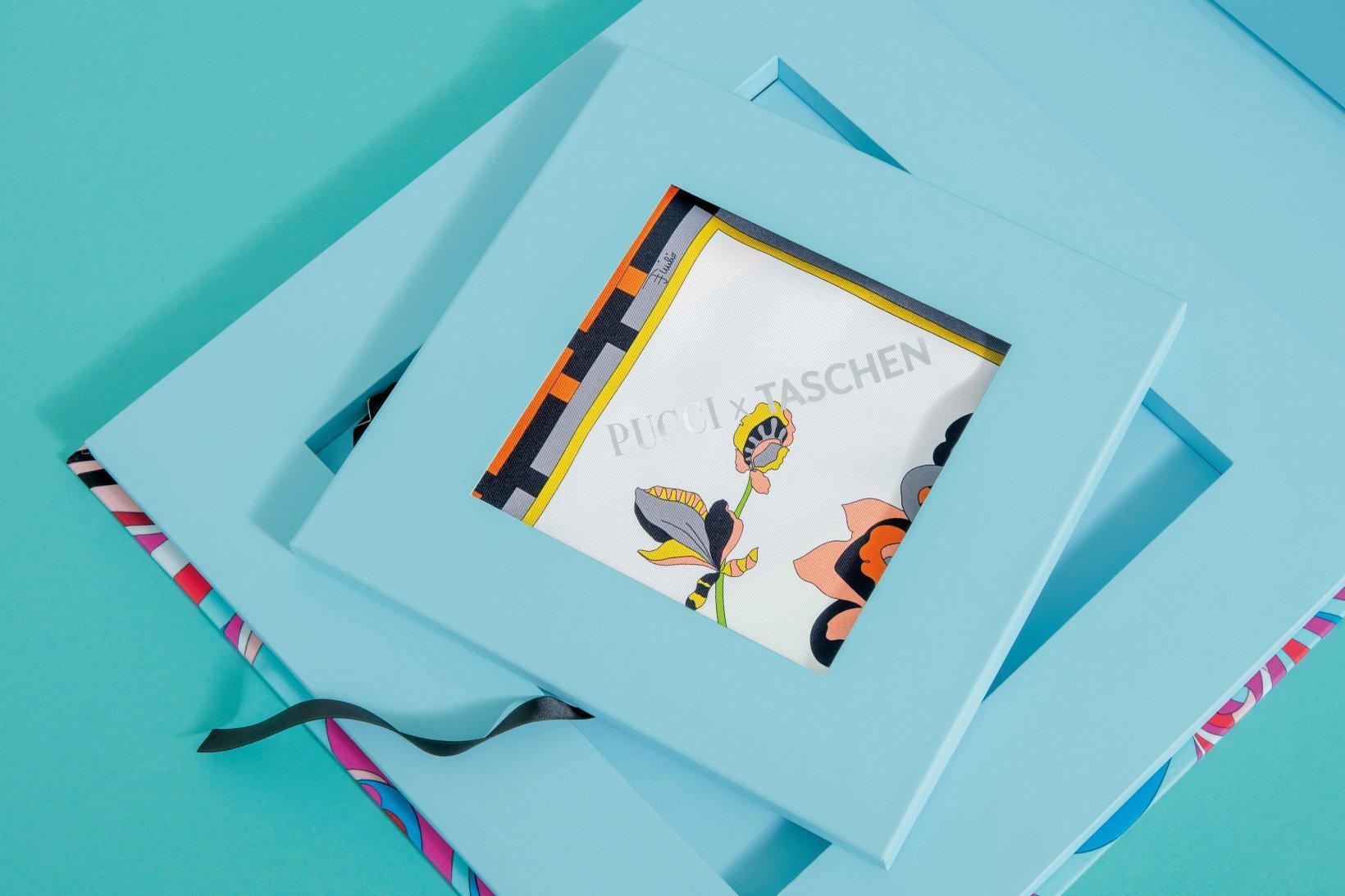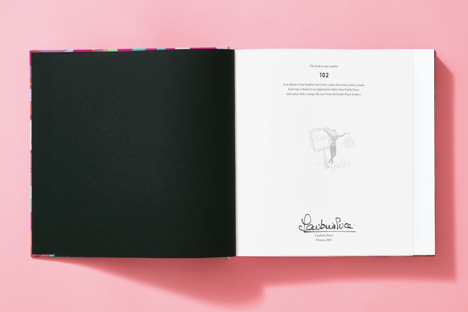 Edición de Arte de 120 copias firmadas y numeradas por Laudomia Pucci. Cada copia está encuadernada con un tejido estampado original de Emilio Pucci y va acompañada de un pañuelo vintage de seda del archivo de Emilio Pucci.