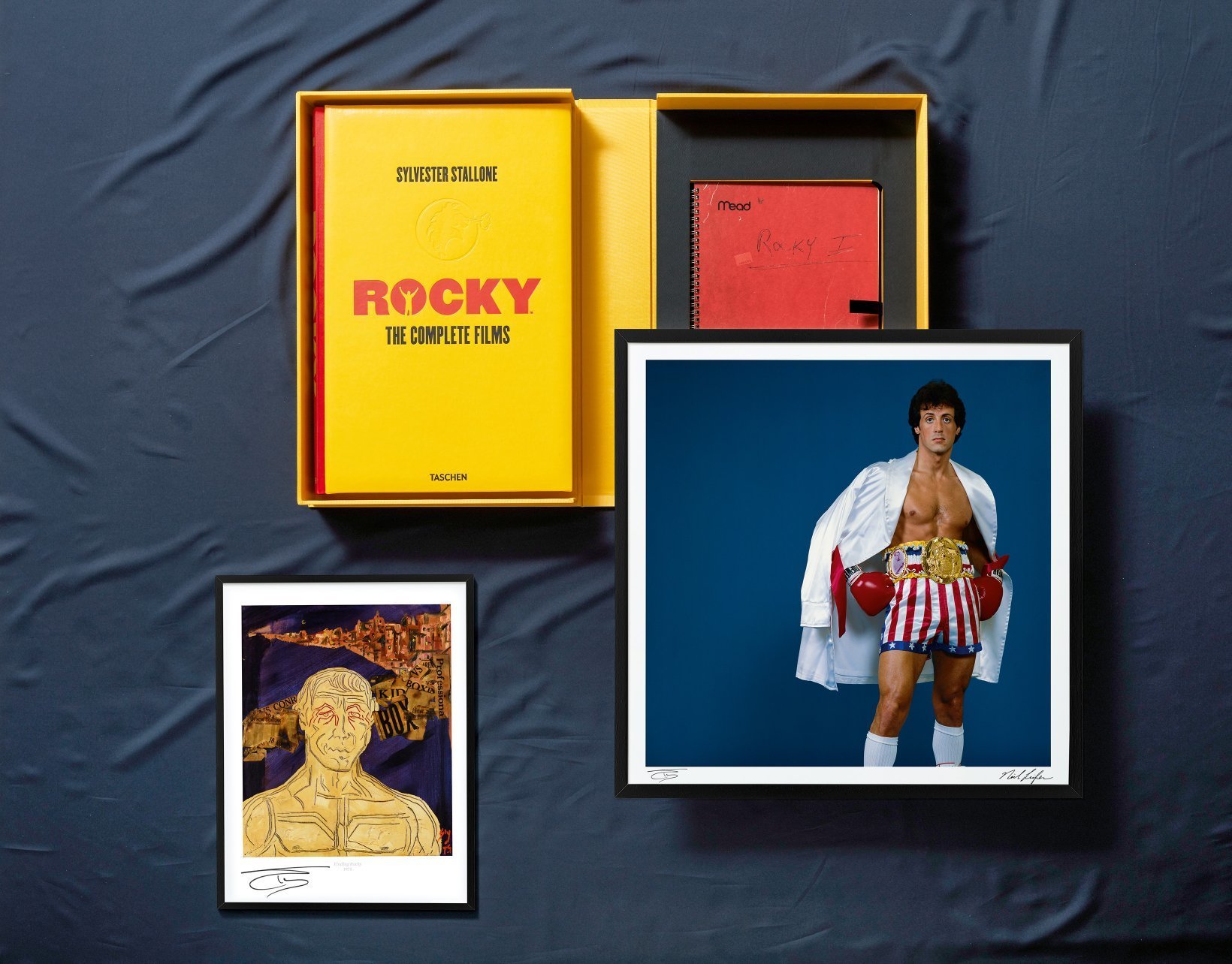 Edición de Arte (nº. 1-25), numerada y firmada por Sylvester Stallone, acompañada por la fotografía impresa con pigmentos Rocky III, 1982, de Neil Leifer, firmada por Leifer y Stallone; una lámina de la pintura de Stallone Finding Rocky (1975), y un cuaderno facsímil de 36 páginas para Rocky