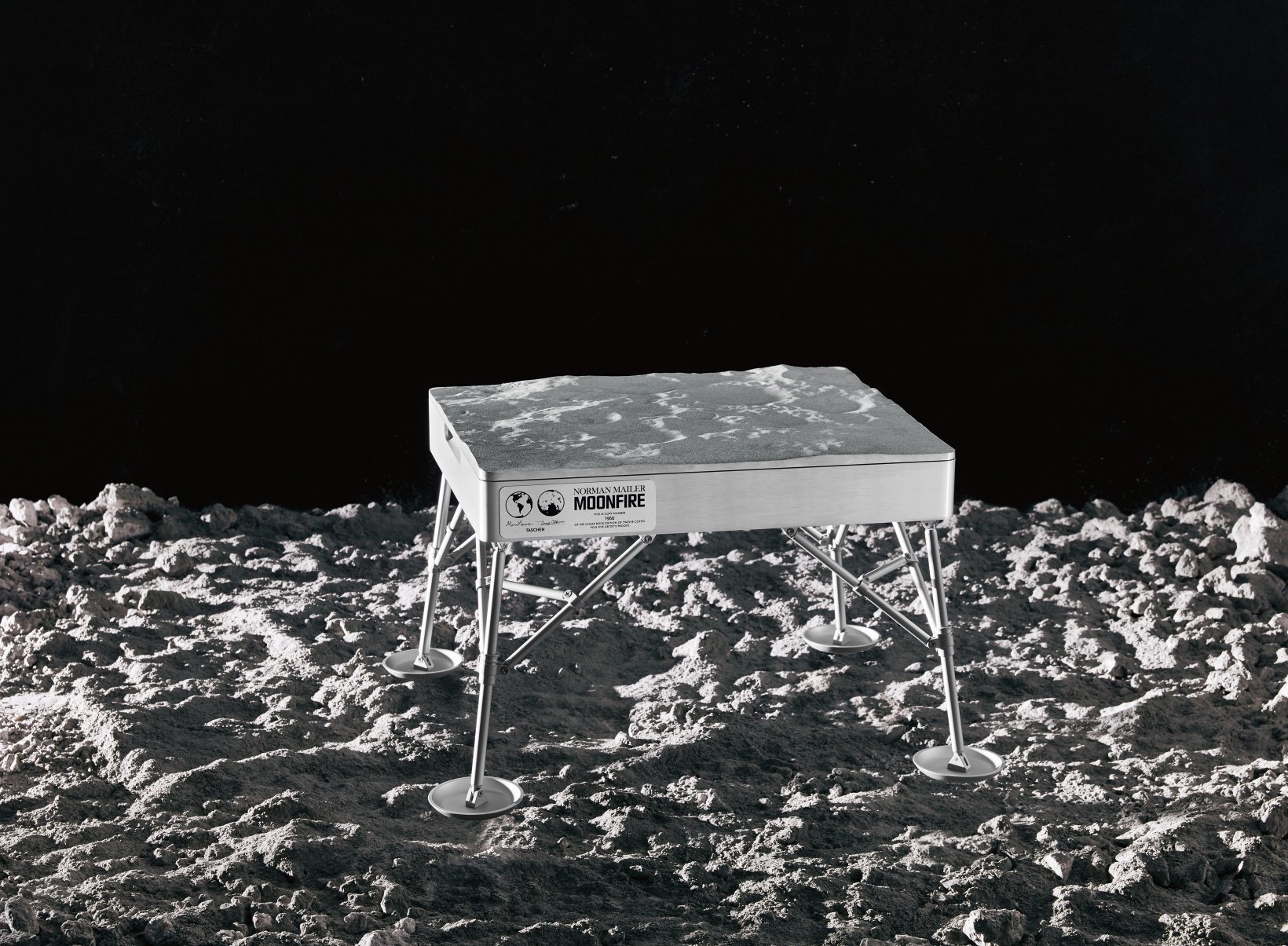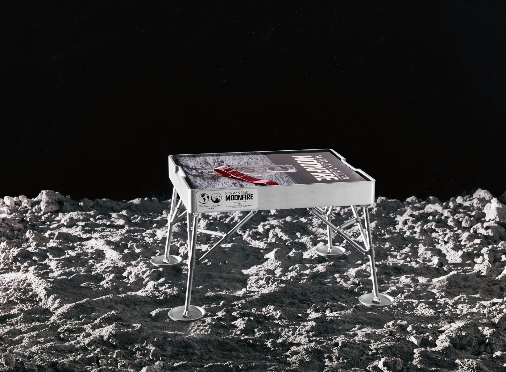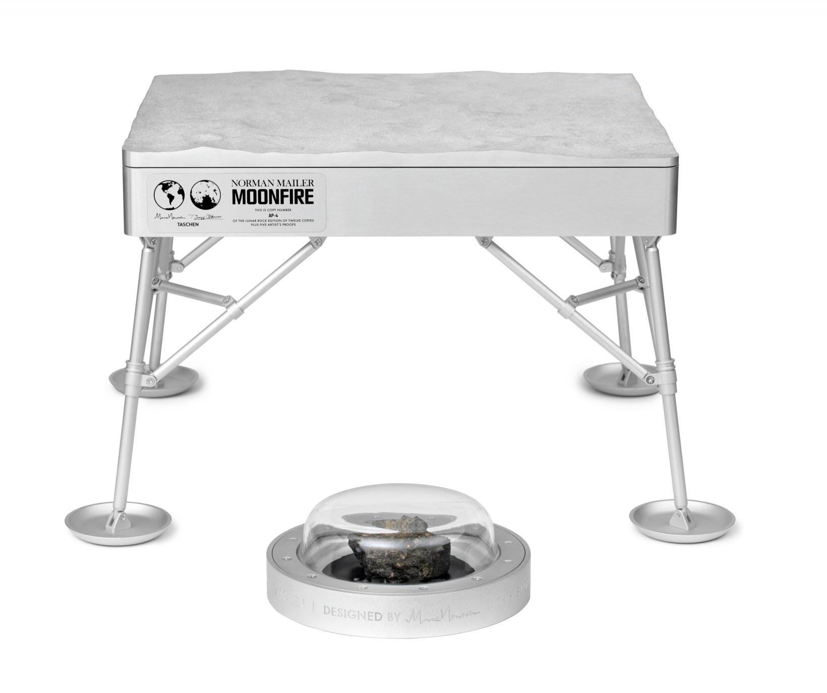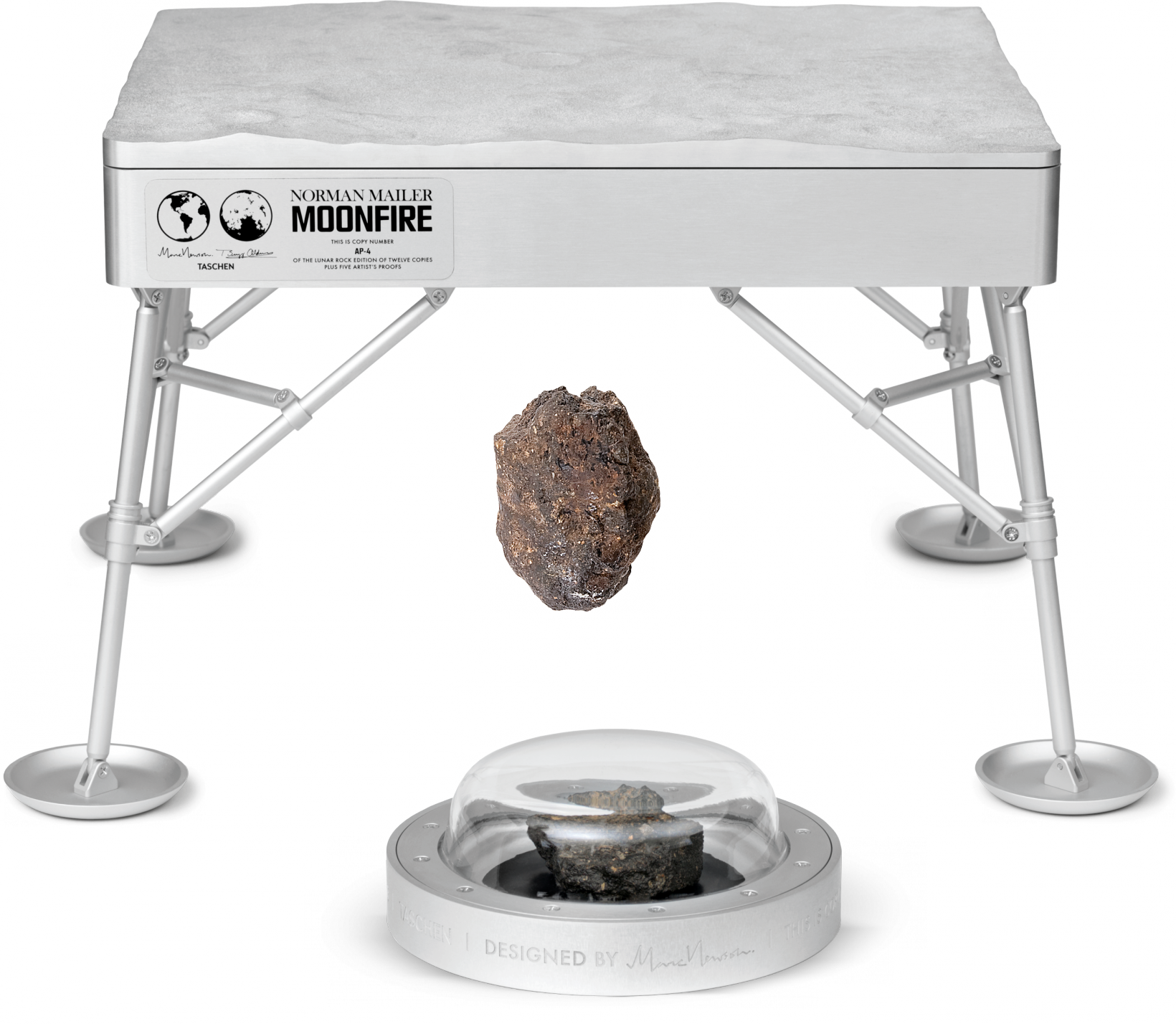 La asombrosa Edición Lunar Rock de Moonfire de Norman Mailer está diseñada por Marc Newson y limitada a tan sólo 12 copias. Cada uno de estos ejemplares únicos se presenta en un estuche de aluminio modelado a partir de una topografía tridimensional real de la Luna e incluye un espécimen único de roca lunar. Acompaña a esta edición un espécimen de brecha feldespática mezclada con basalto fresco y sólido. Se trata de la masa principal de un meteorito lunar, algo muy poco corriente.