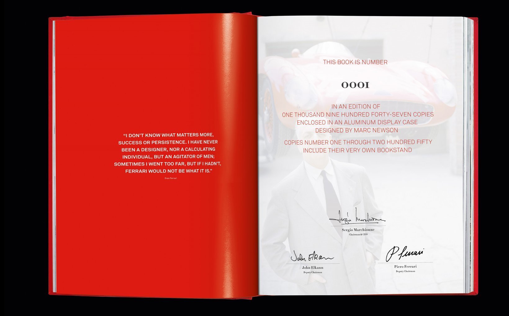 Edición de Arte (n.° 1–250) con un atril escultórico de Marc Newson, firmada por Sergio Marchionne, John Elkann y Piero Ferrari